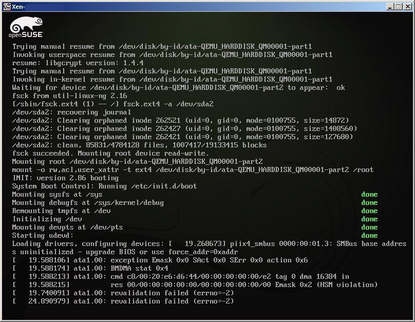 Hello,I have a strange problem. When I freshly install a openSUSE 11.2 from dvd as a domU (hvm) it works fine. It reboots as many time as I want, there is no problem. When I make a online update to get all the latest fixes the openSUSE 11.2 it fails to boot. It doesn't seem to see the hd anymore. The boot sequence state some exceptions at the ata1 including a HSM violation. attached a screen shot of the boot sequence Anybody any idea why this is happening? Dom0 openSUSE 11.2 x64 xen 4.0.0 changeset 20900 DomU openSUSE 11.2 x64 (hvm) mfg, jeroen Attachment: